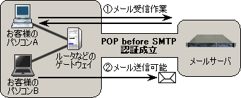「お客様のパソコンA」がメール受信作業を行っていた場合、POP before SMTP機能の認証が成立しておりますので、「お客様のパソコンB」はメール受信作業を行わなくてもメールを送信することが可能になります。