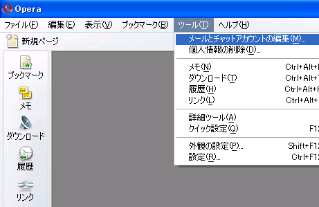 Opera を起動し、メニューバーの【ツール】から【メールとチャットアカウントの編集】をクリックします。
