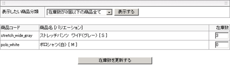 在庫数を編集したい商品分類を指定し、【表示する】ボタンをクリックして、表示された商品の右側にある「在庫数」を編集します。 在庫数を変更したら、【在庫数を更新する】ボタンをクリックして、変更を反映させます。