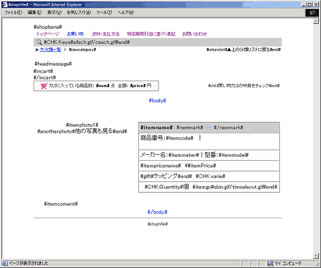 この変数は、登録されている商品説明文に変換されて表示されます。 この説明文はHTMLタグが使用できますが、もうひとつ、この商品詳細の#body#〜#/body#で使用できる変数も使えます。